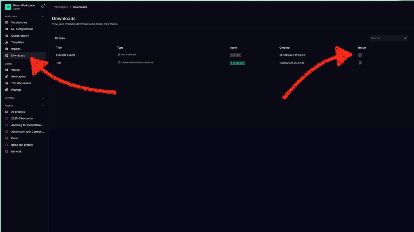 Go to Downloads under Workspace in the left panel. On the Downloads page you will see the history of your exports as well as the progress of your current export. Once it is done you can click the download button on the right side of the line item.