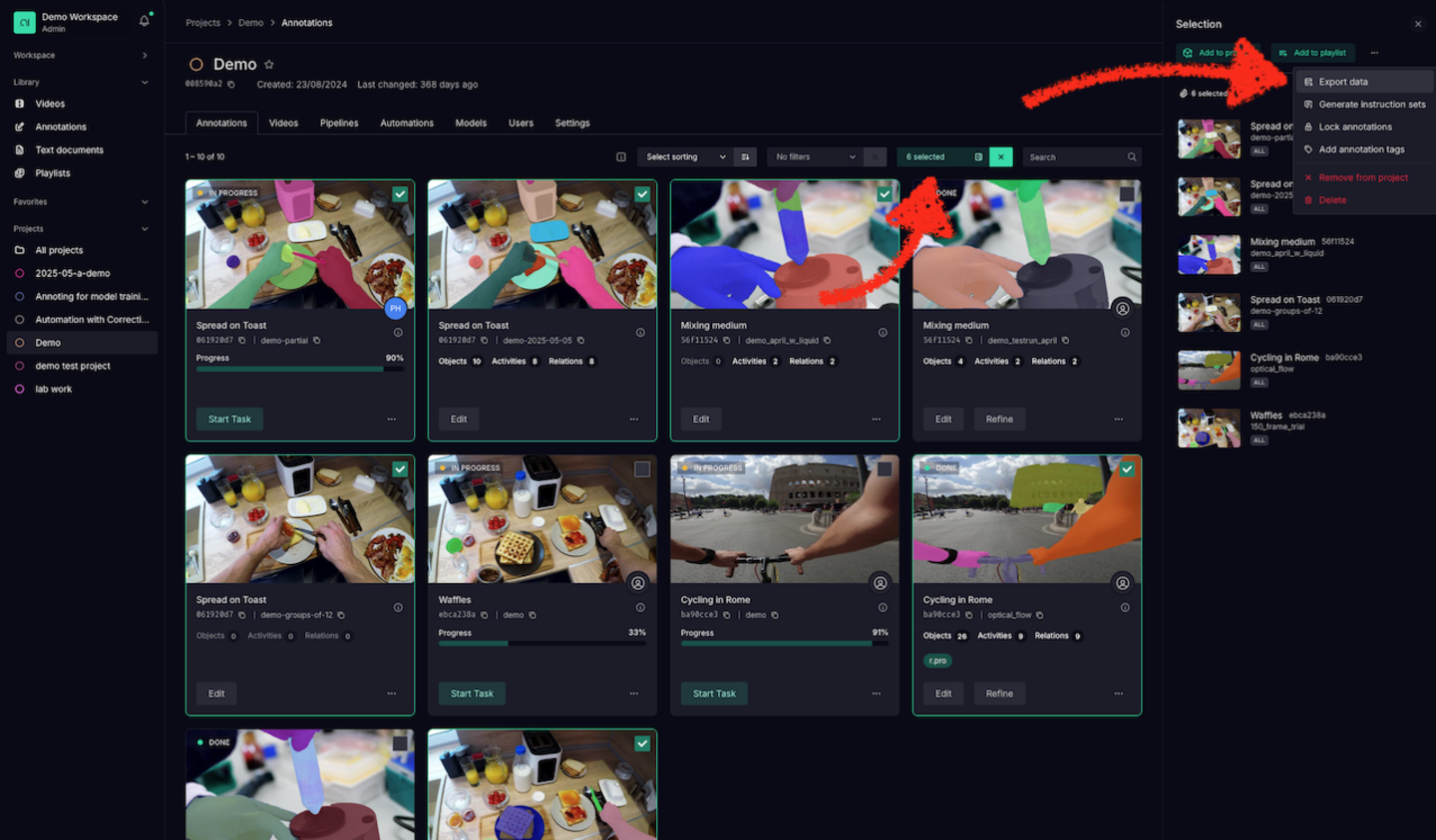 After selecting the annotations you want to export, click the highlighted button and a side panel will open. In the side panel hit the three dots (…) on the top right and choose Export data.